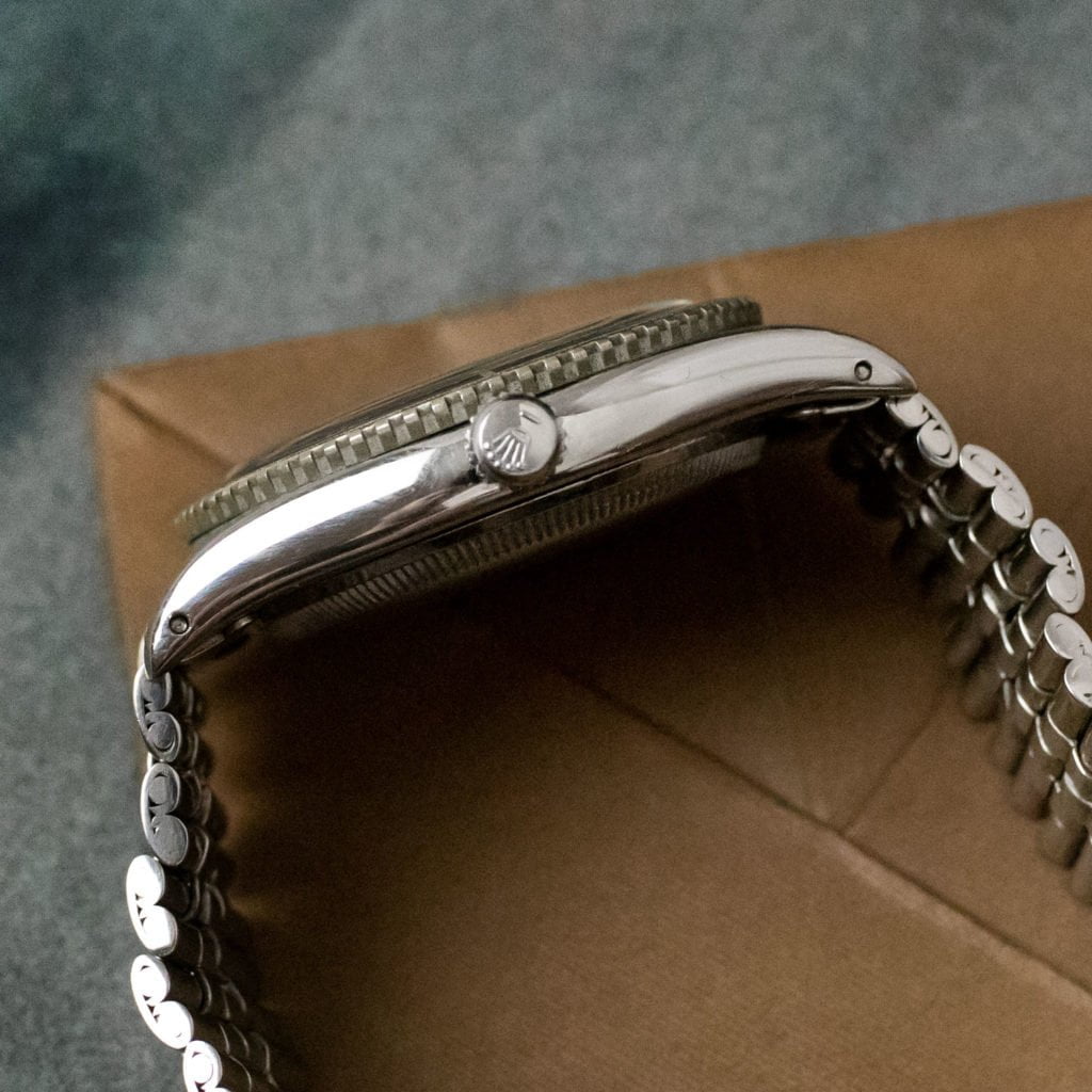 The reference 6202 was launched in 1953 and its introduction made it a very important year. Not only for Rolex but for the entire world of horology. In case you were wondering why. Well, the 6202 became the blueprint of what would later become the Rolex Submariner and it formed a great inspiration (maybe even the foundation) for the designs of all other Rolex - and non-Rolex sports and even non-sports - models. The Turn-O-Graph is seen as the watch that started it all, that created the different categories of watches. It's the alpha model, an historical artifact, a game changer and for many aficionados, the ultimate grail watch.The watch has a rotable bezel. Eventhough, it's not the first one as this is the Rolex Zerographe introduced in the '30s. It has a full gradation and the classic, red triangle. In this case, the red triangle has faded over the years. It can easily be seen that the stainless steel case is a prototype design of the Submariner. It measures 36 mm which makes it a smaller tool watch like the first Submariner references. The watch comes on a stainless steel folded Jubilee bracelet. A fun fact: the entire movement (calibre A260) of this watch is gold plated. The dial of the watch has been replaced later on, which is why it says Swiss - T < 25 below the 6-hour position. Most 6202's have service dials as Rolex had to replace them during service because of regulations regarding radio activity. The service dial used on this example is in beautiful condition.One year later, the watch got discontinued making it not only historically very important but also very rare and highly collectible.