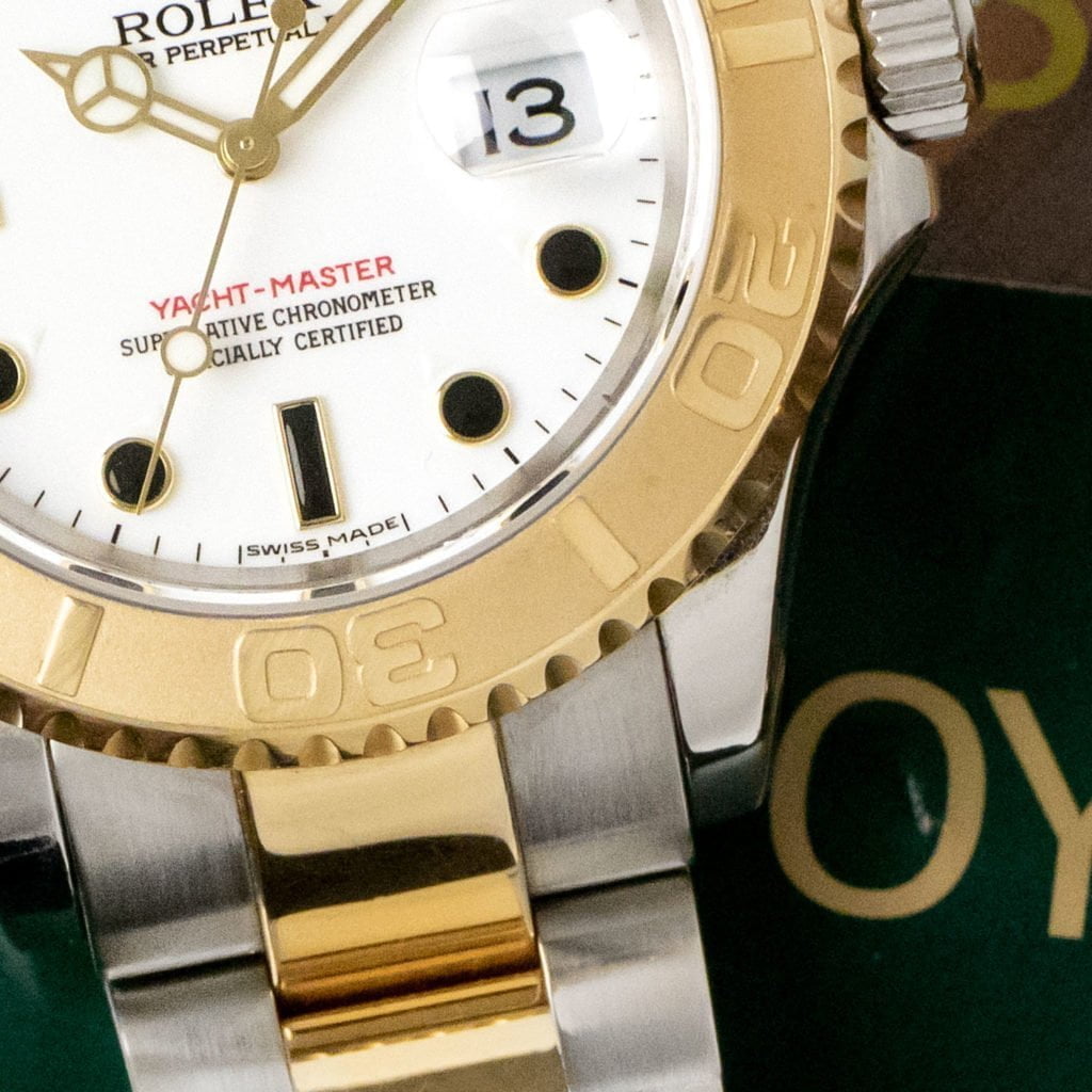 In 1992 the Rolex Yacht-Master, under reference 16628, made its appearance to the market. The introduction of this model marked an interesting turning point for Rolex as the brand became more luxury oriented instead of focused on purpose. In design it strongly resembles the Submariner but it's more refined and has a more luxurious look and feel. This reference 16623 dates back to 2007. The case is from stainless steel, the bezel and centre links of the Oyster bracelet are from 18k yellow gold. What we like, is the white dial with black markers with 18k yellow-gold hour marker surroundings and the luminova triangles. The watch runs, just like the Submariner and Sea-Dweller, on a caliber 3135. It comes as a full set.