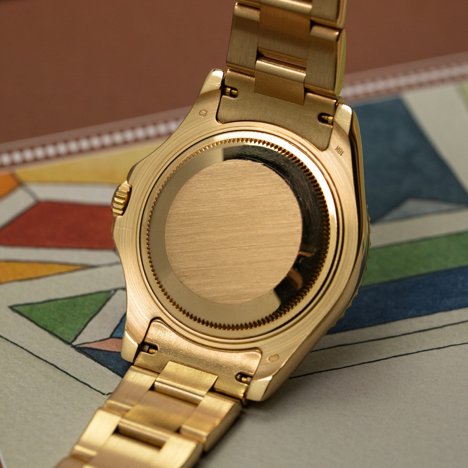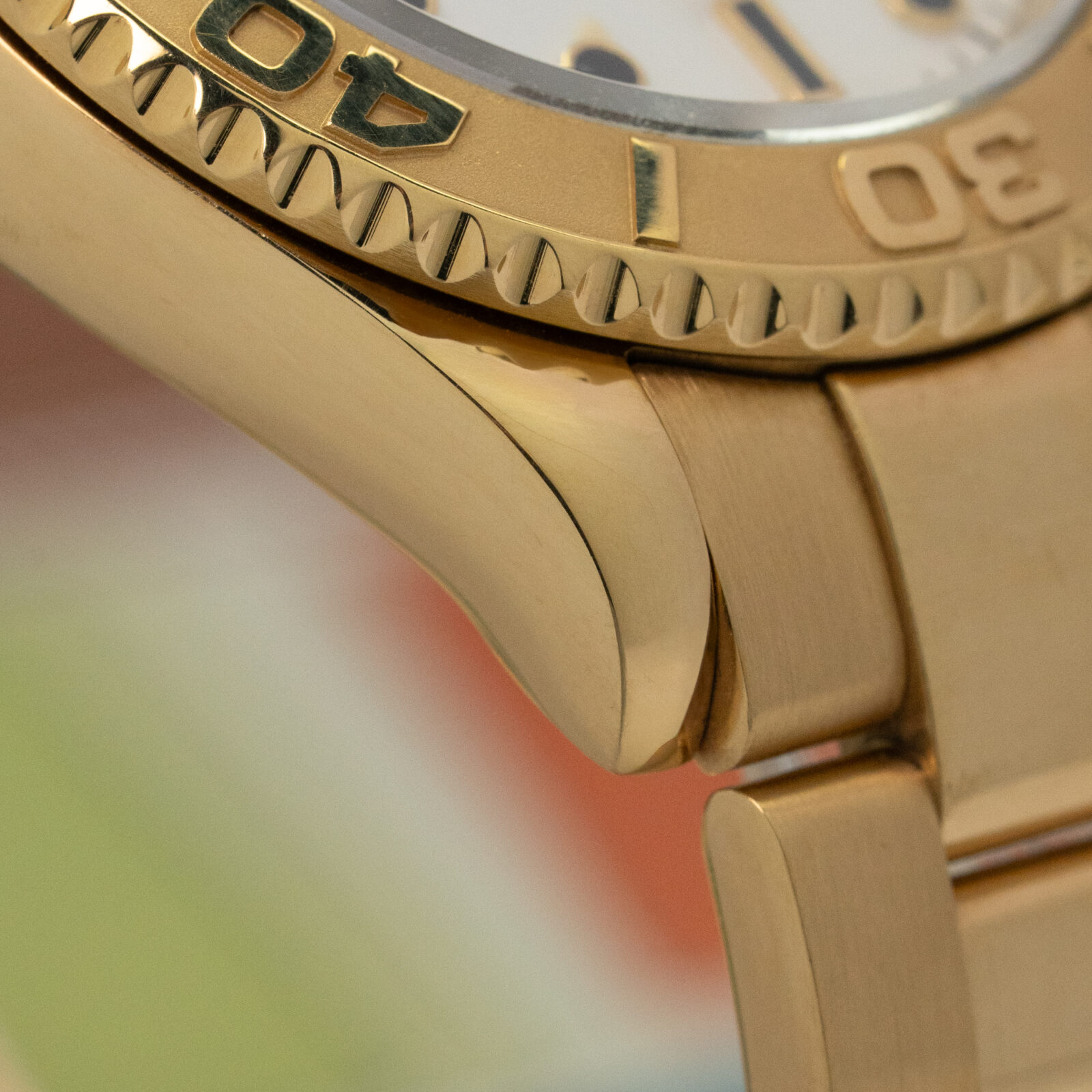 The white dial gives the watch a clean, balanced look. The applied gold markers and hands catch light just enough to break the matte calm, while the red “Yacht-Master” text adds a quiet touch of color that ties the design back to sea and speed. The engraved bezel isn’t there for show (or is it? Yup, actually I’m pretty sure it is but whatever); it gives the case dimension, weight, and a sense of function.