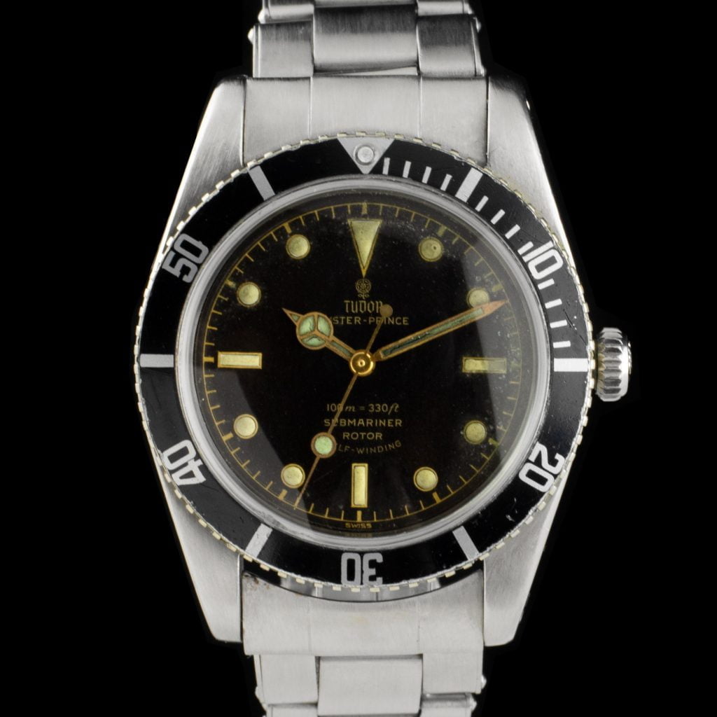 7922The first TUDOR divers’ watch was presented in 1954. It bore the name TUDOR Oyster Prince Submariner, reference 7922. It was a self-winding watch unique in the brand’s collection. Its features corresponded to its function as a divers’ watch: a case with a screw-down back and a crown whose waterproofness was guaranteed to a depth of 100 metres, large hour markers and hands with luminous material for easy reading in deep water, as well as a bidirectional rotatable bezel graduated in 5-minute intervals to precisely measure dive time and allow for the adjustment of the decompression stages. Its black lacquered dial, subtly domed, was designed to optimise contrast with the indications it bears – the gilt inscriptions “OYSTER PRINCE” at noon under the brand logo, and “100 m = 330 ft”, “SUBMARINER”, “ROTOR”, “SELF-WINDING” on four lines at 6 o’clock. There is also a reminder of its guaranteed waterproofness at 6 o’clock, in metres and in feet. Its Tropic-type Plexiglas crystal was dome-shaped for better water pressure resistance. Its movement was the self-winding calibre 390, developed on a Fleurier movement-blank with a frequency of 18,000 beats per hour. Finally, its 5 mm-diameter screw-down crown and its Oyster-type braceleSpecifications