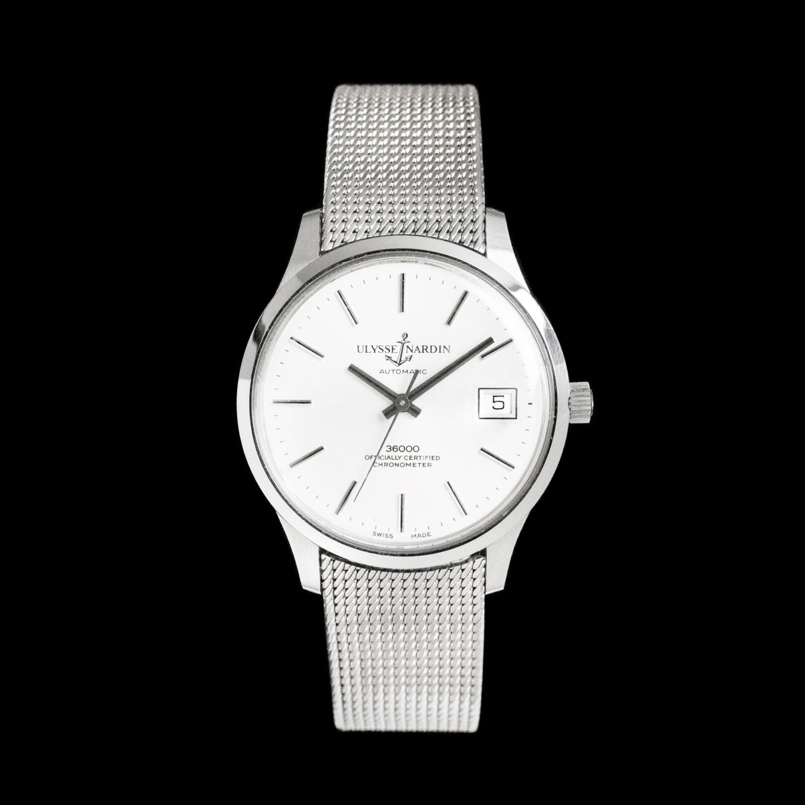 A stylish dress watch from the dignified Swiss watch brand Ulysse Nardin.This elegant dress watch with a case that measures 36 mm in diameter and is made from stainless steel comes on a very cool stainless steel Milanese bracelet. Its simplistic design would look great under a suit but also with a casual outfit. It's cool that this watch has a movement that beats 36.000 times per hour, which is a lot more than the most watches and therefore, the second hand sweeps very smoothly.This automatic wrist watch dates back to 1975. It comes with the original box and papers.