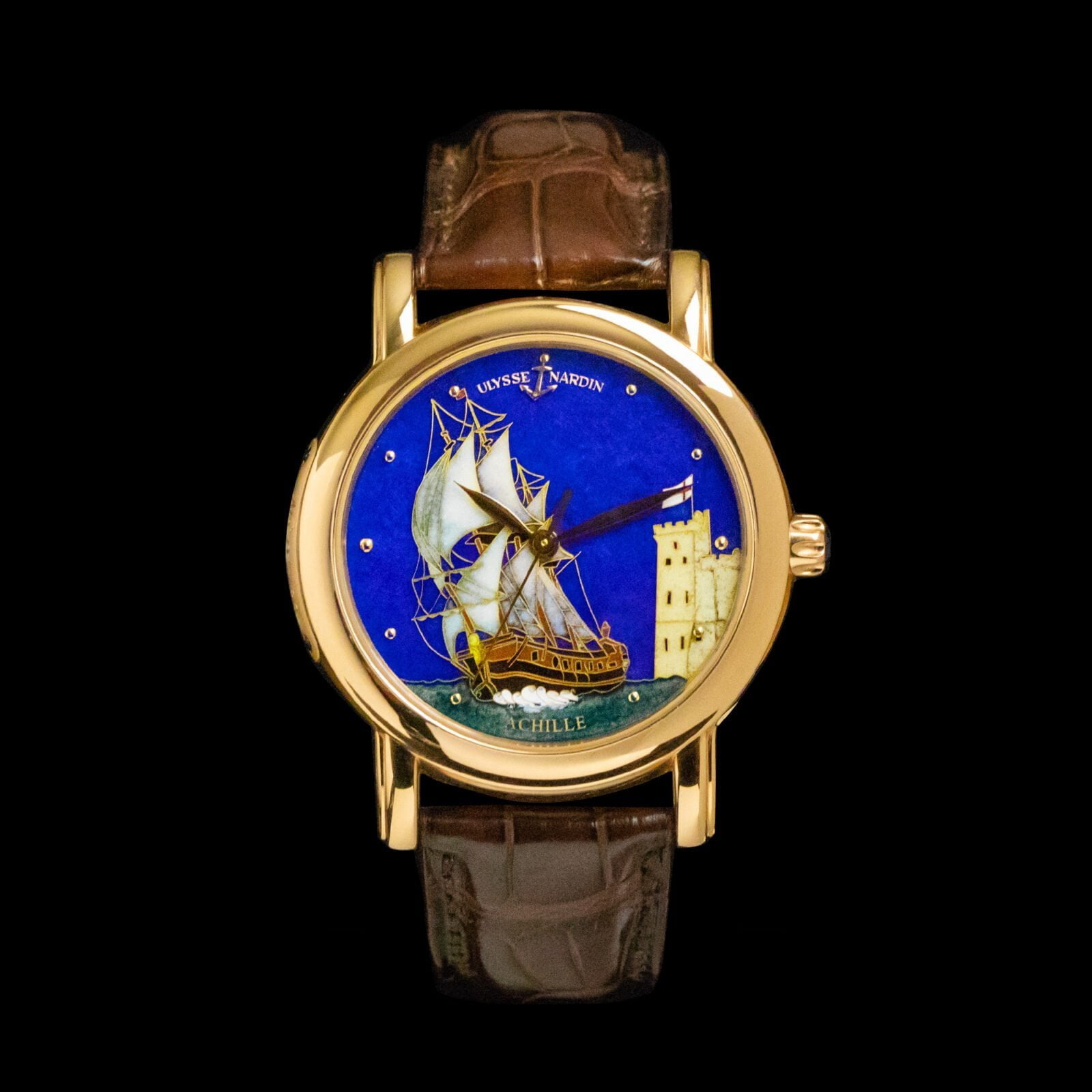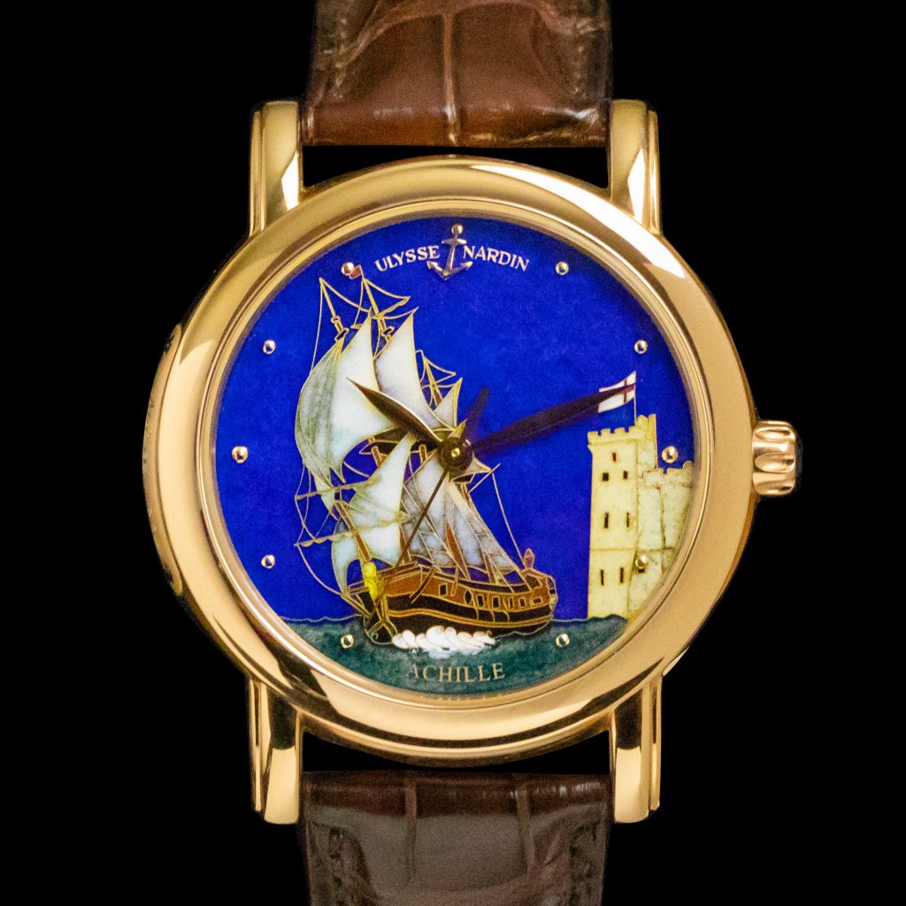 If you just buy watches to check the time this watch is definitely not the right one for you. If you buy watches because of their beauty and the fact that you can appreciate fine production techniques, then you should definitely take a closer look at this stunner.This delicate piece, made by Ulysse Nardin, is an incredible piece of art. The watch is made out of 18k rose gold and dates back to the year 2009. It has a case size of 40 millimeters and runs on Ulysse Nardin’s in-house caliber UN-13 which you can admire through the watch’s sapphire case back.Underneath the watch’s sapphire crystal we’ll find the French sailing yacht ‘Achille’ which was the first sailing yacht that arrived in England during the battle of Trafalgar in 1805. The watch’s dial is made using the advanced ‘email cloisonné’ technique in which 0,06 millimeter thin golden wire is used.The watch comes with its original box and papers.