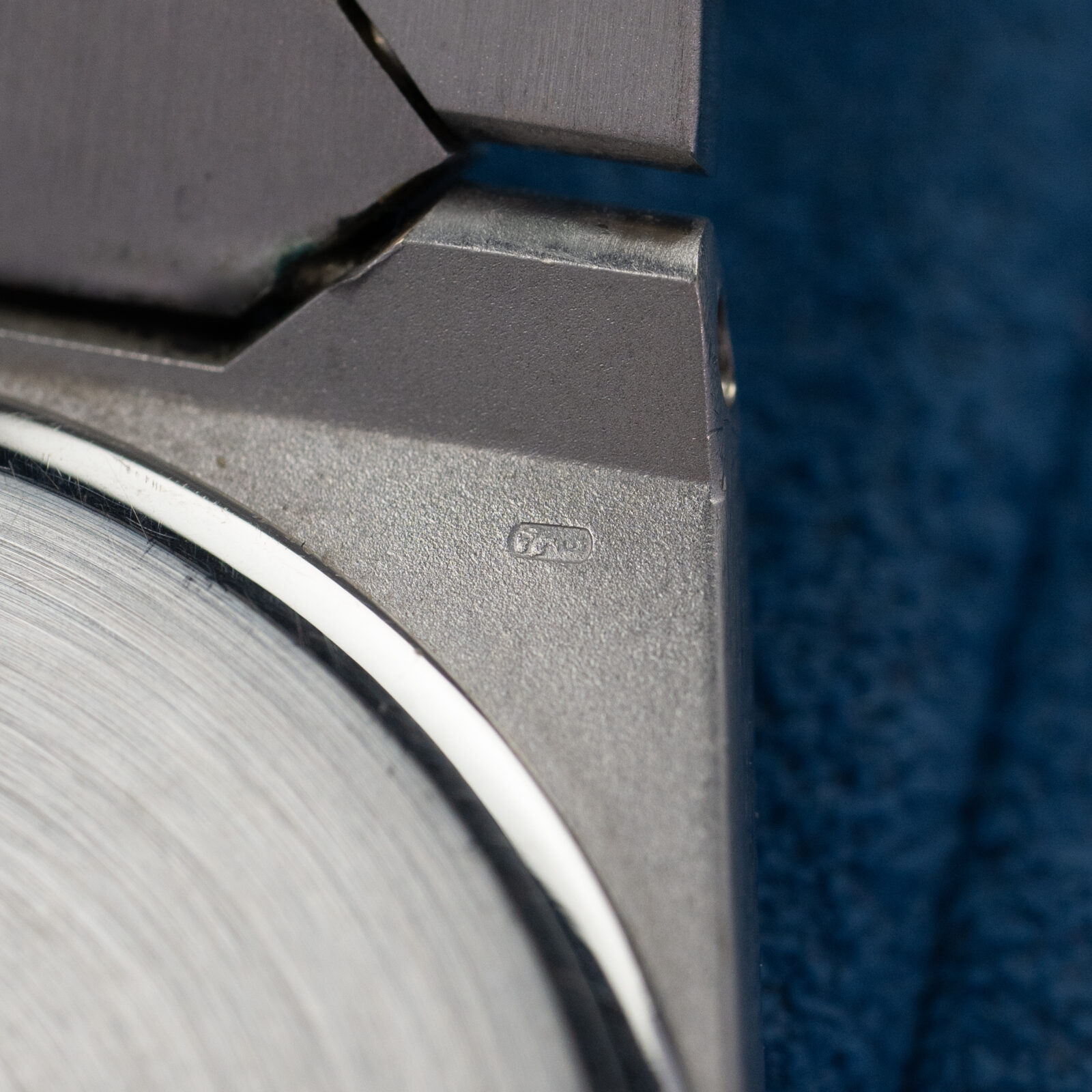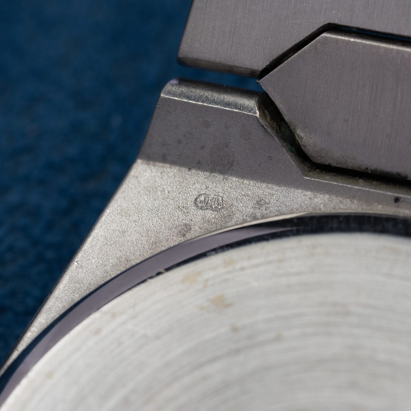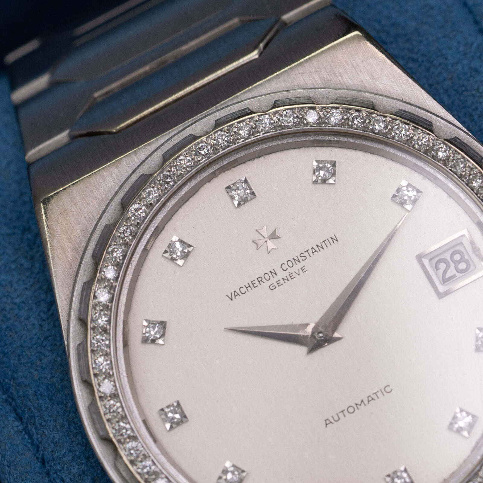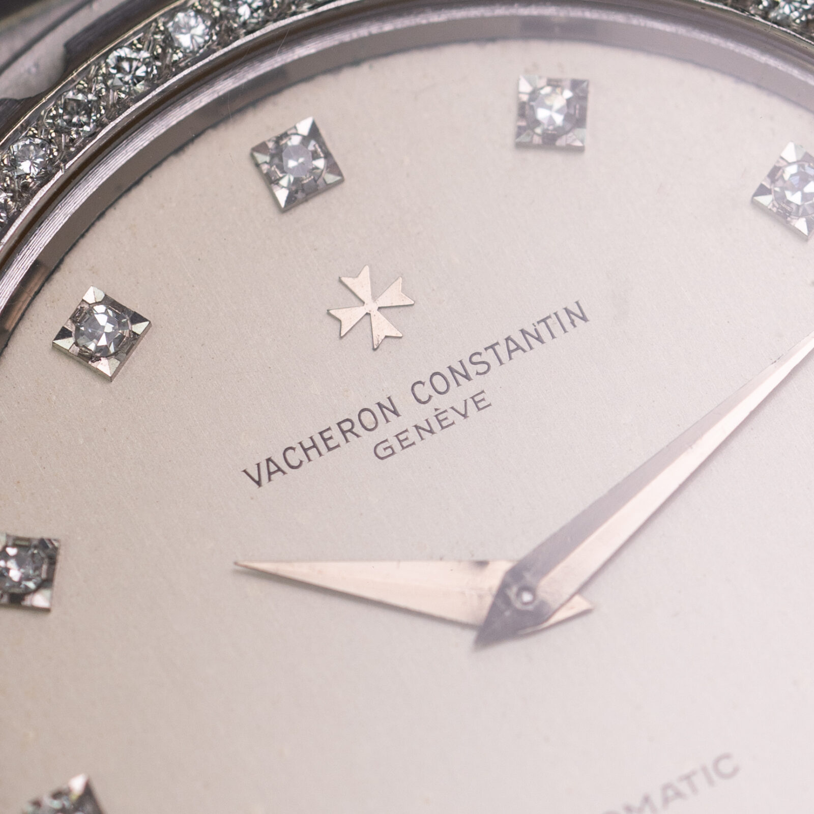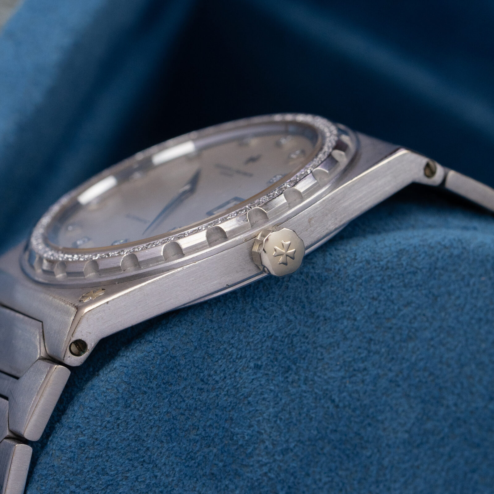 Besides the bezel, we can also find 11 brilliant cut diamonds on the satin-finished grey dial. According to the original papers, the carat weight totals up to 0.56, divided into 60 stones. Another interesting aspect of this dial, as opposed to the more common varieties with baton markers, it does not feature a minute track with hash marks. Furthermore, since there is no lume on the indices, the handset used is different and more elegant: faceted dauphine hands. The periphery of the dial has some slight imperfections and the surface has aged over time, resulting in minor blistering.
