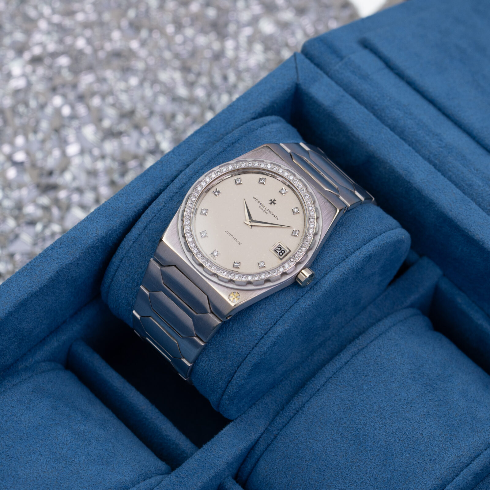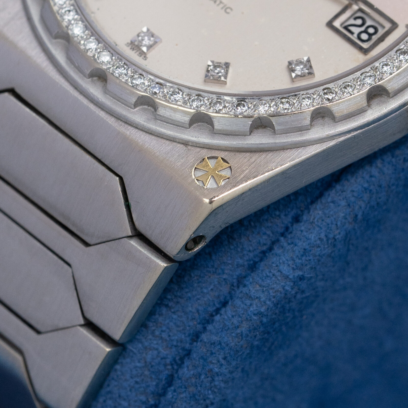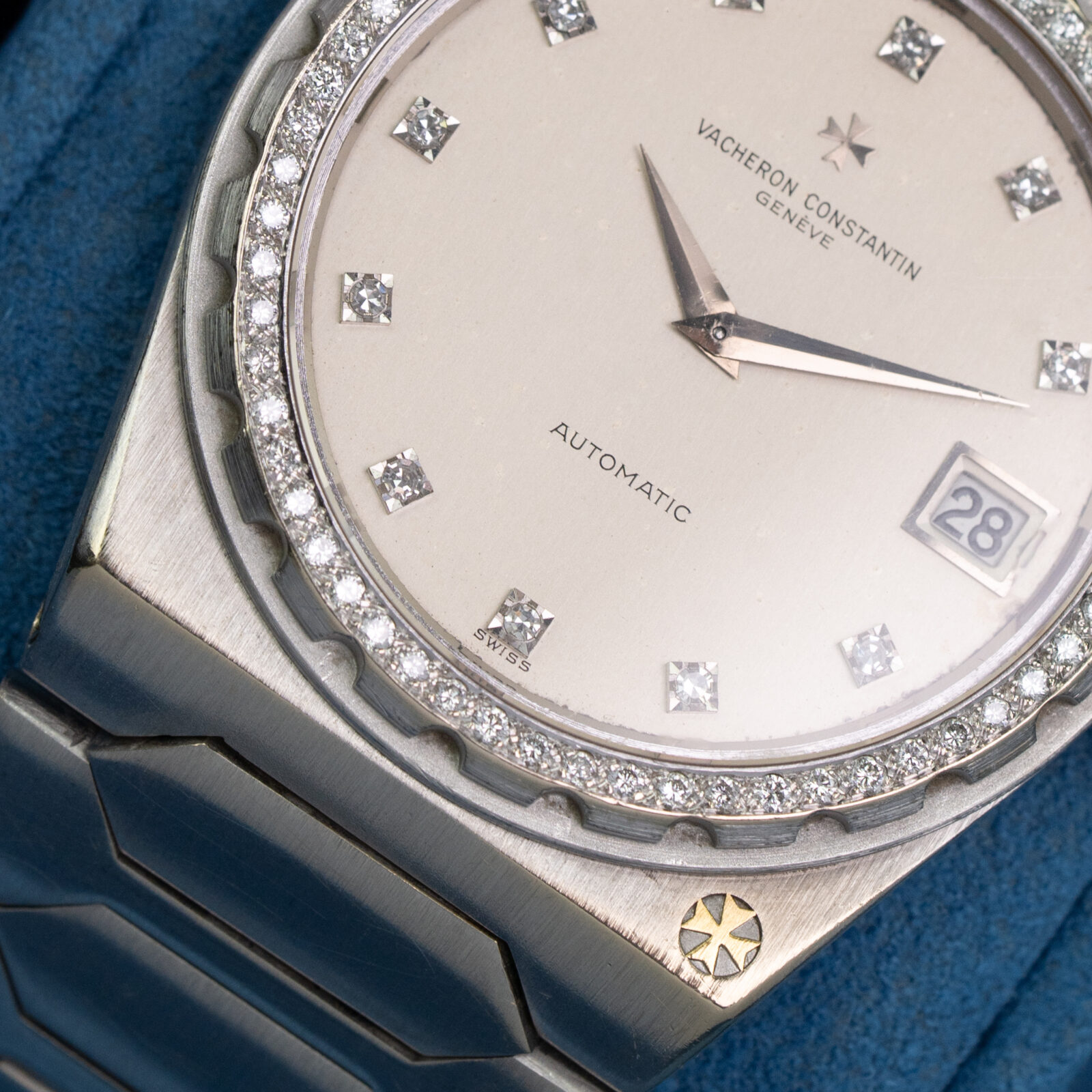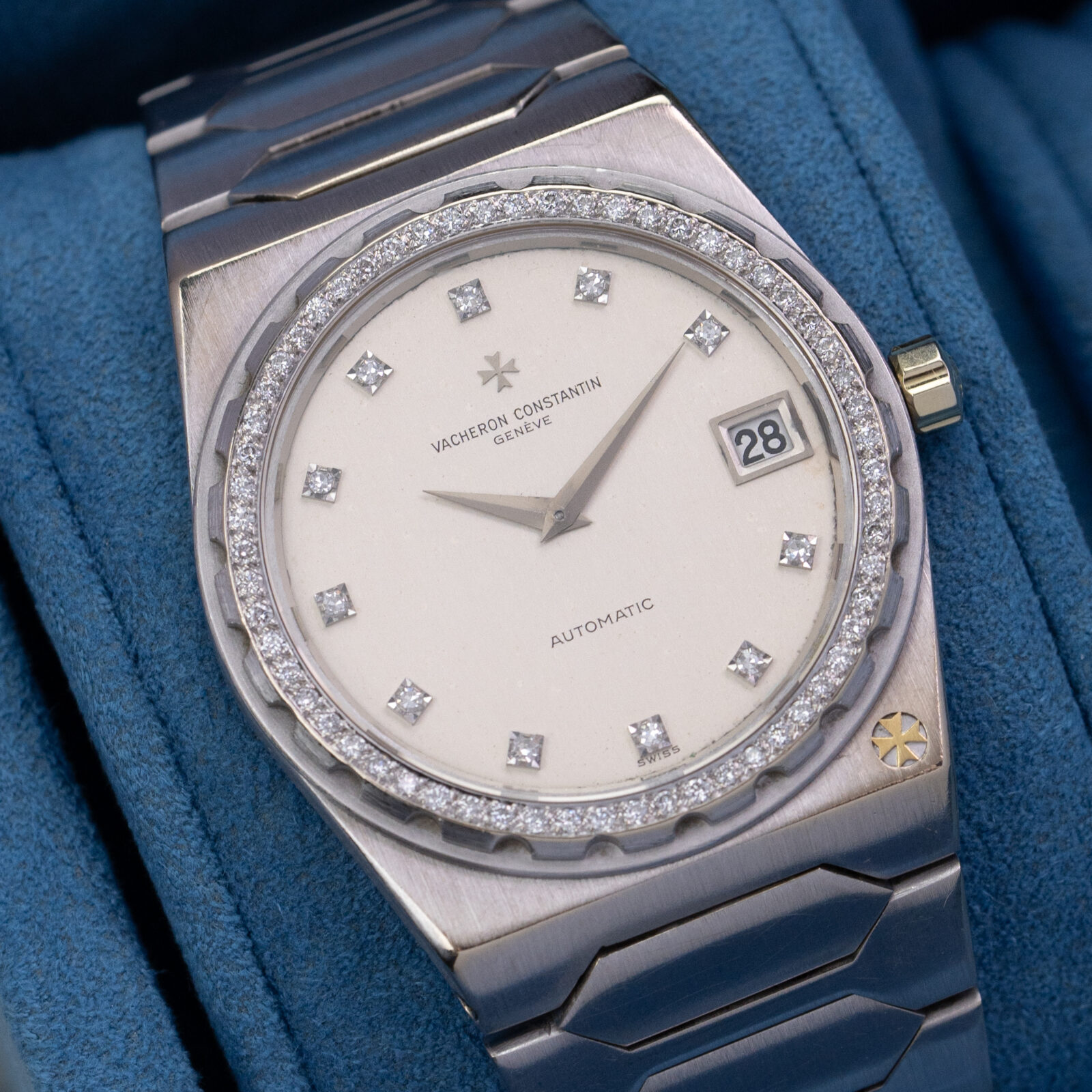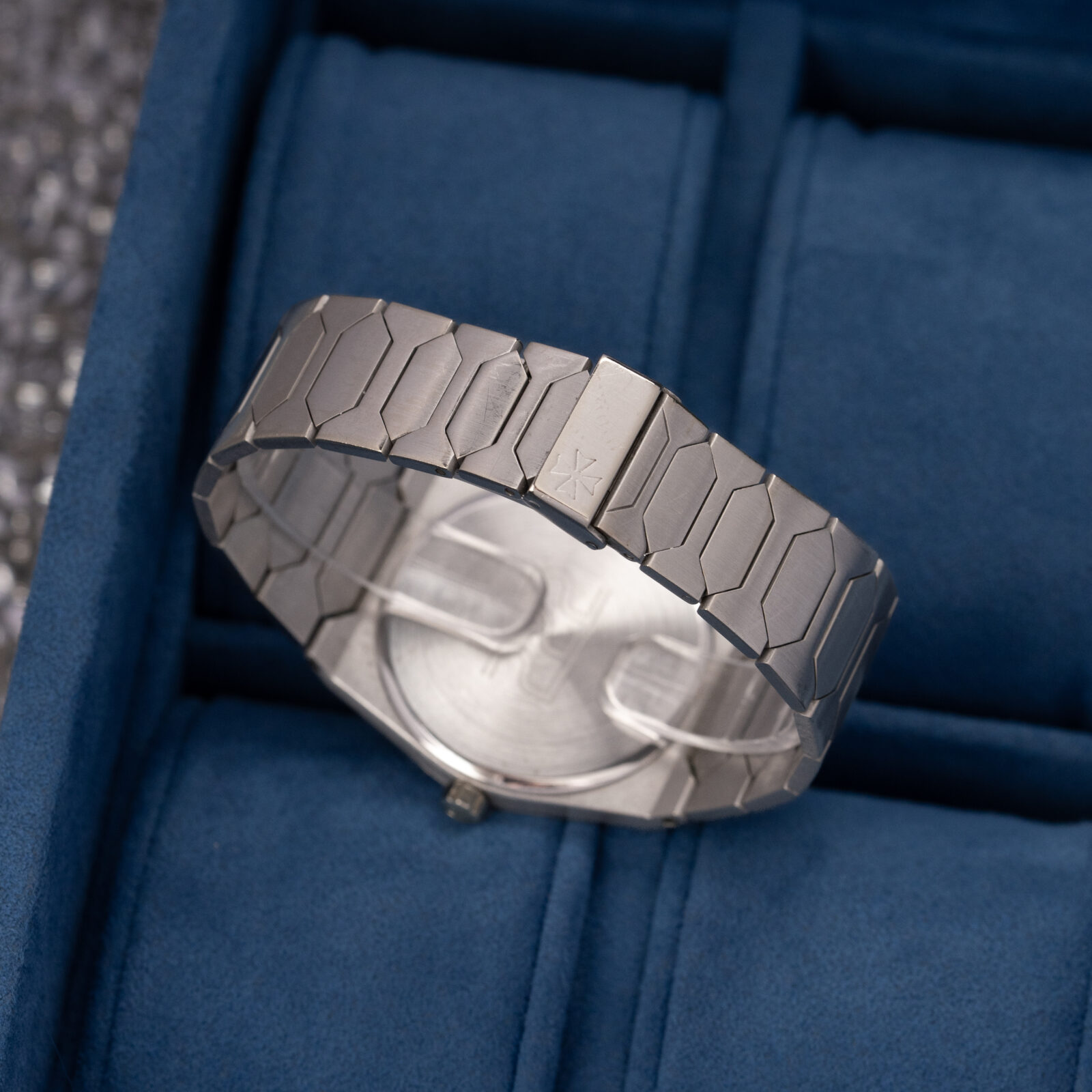 Unlike the earlier three brands, Vacheron Constantin did not turn to Gerald Genta but opted to enlist Jörg Hysek, an upcoming designer, to envision a new watch. Hysek employed the same basic design language found in Genta’s creations: an ultra-thin cushion shaped case with broad shoulders and an integrated flat-link bracelet with large geometric center links. The distinctive serrated screw-down bezel and stamped Maltese cross on the lower-right corner of the case, however, clearly set the design apart from its Genta-designed forebears.