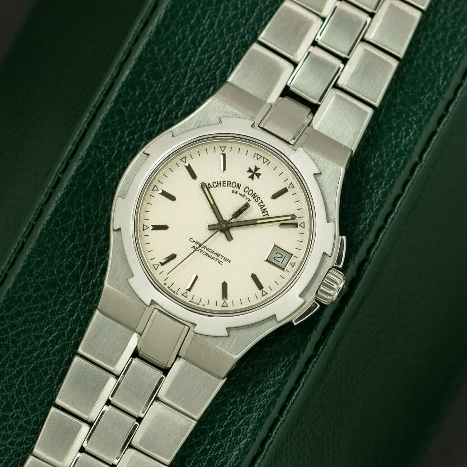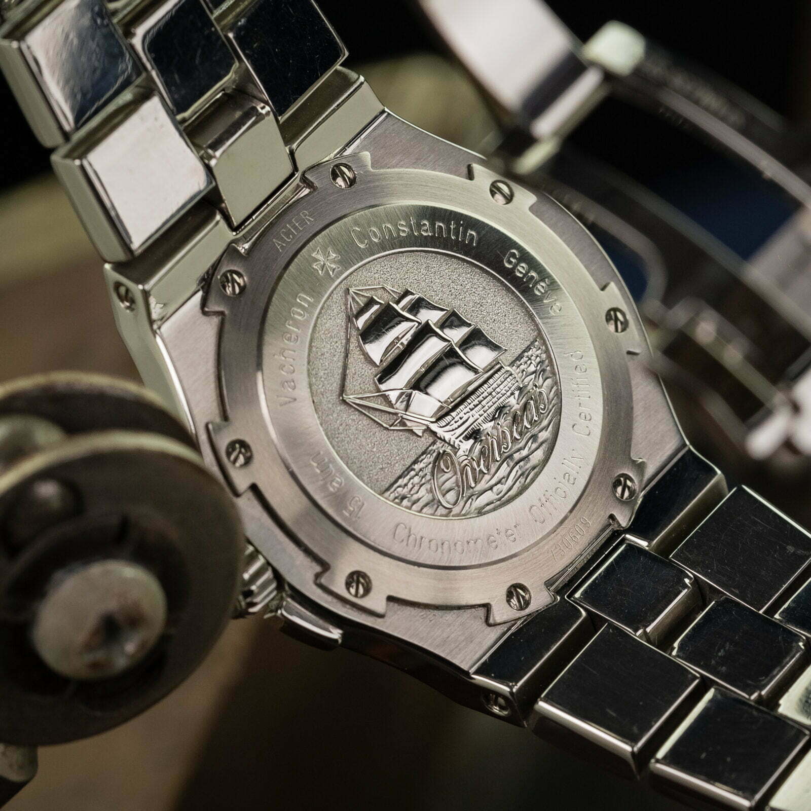 This ref. 42042 is a later execution of the first Overseas production run as it dates back to 2001. The watch features a 37 mm stainless steel case with a fantastic chunky brick-style bracelet. The caseback, meanwhile, sports an engraved depiction of Amerigo Vespucci’s three-masted ship, whom the American continent was named after.