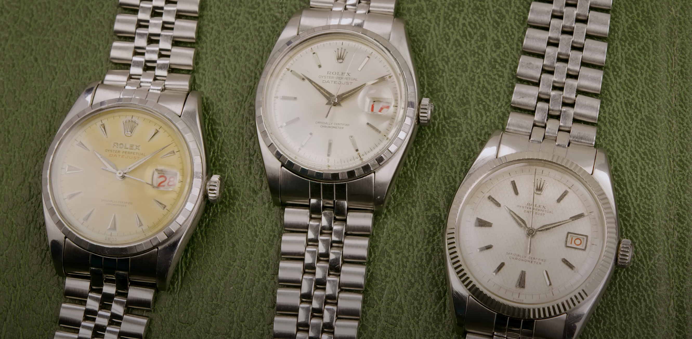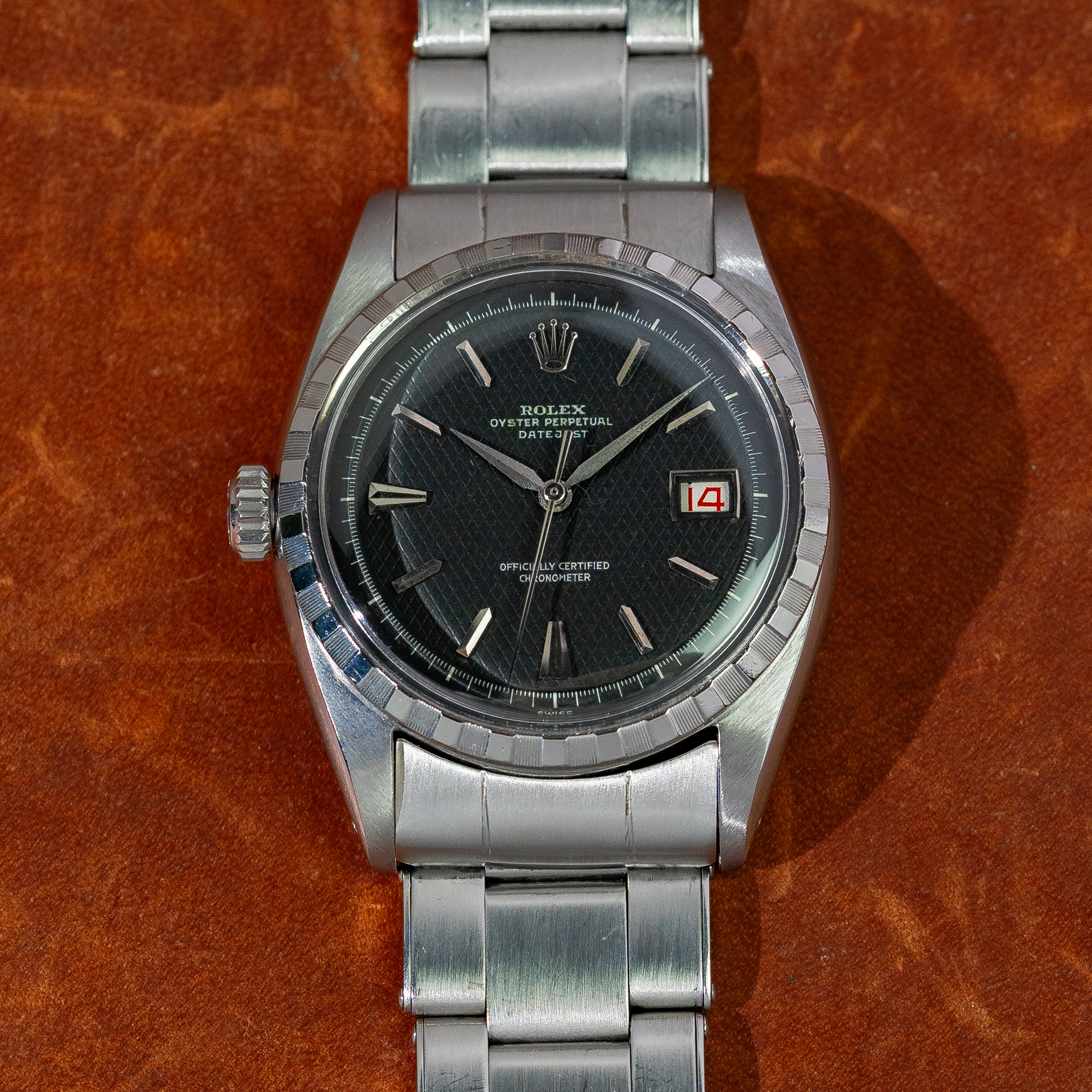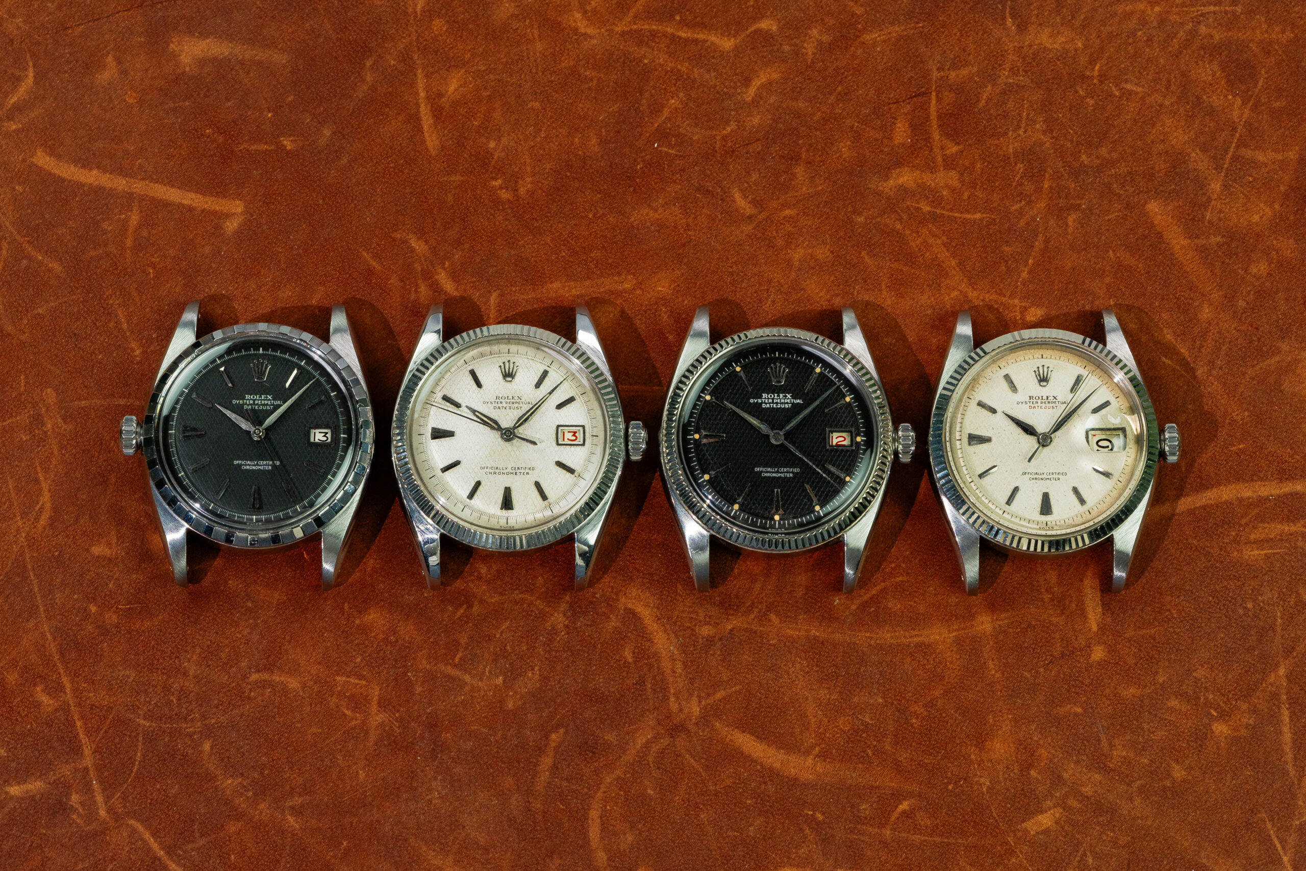 There are 3 shapes of dials used. Either flat, a tad convex with a domed periphery, or a soft “pie-pan”: less angular as the 16xx series. Last mentioned is seen on the most coveted type of dial, which isn’t one with a smooth surface but with a waffle motif instead; also known as “Honeycomb”. Not unique to the Datejust, Rolex used this embellishing pattern on multiple models in the 50’s: like the 6202 Turn-O-Graph and the 6350 Explorer. (among others) However, this is considered the pinnacle of steel Rolex Datejusts and the value can run into the 6 digits. Apart from the shade, black or white, there is also a variety in the cliché used. Besides the spacing and graphics of the font, the clearest difference can be found in the smooth outer track: one being divided into 10 segments per 5 minutes, the other 5 segments per minute.