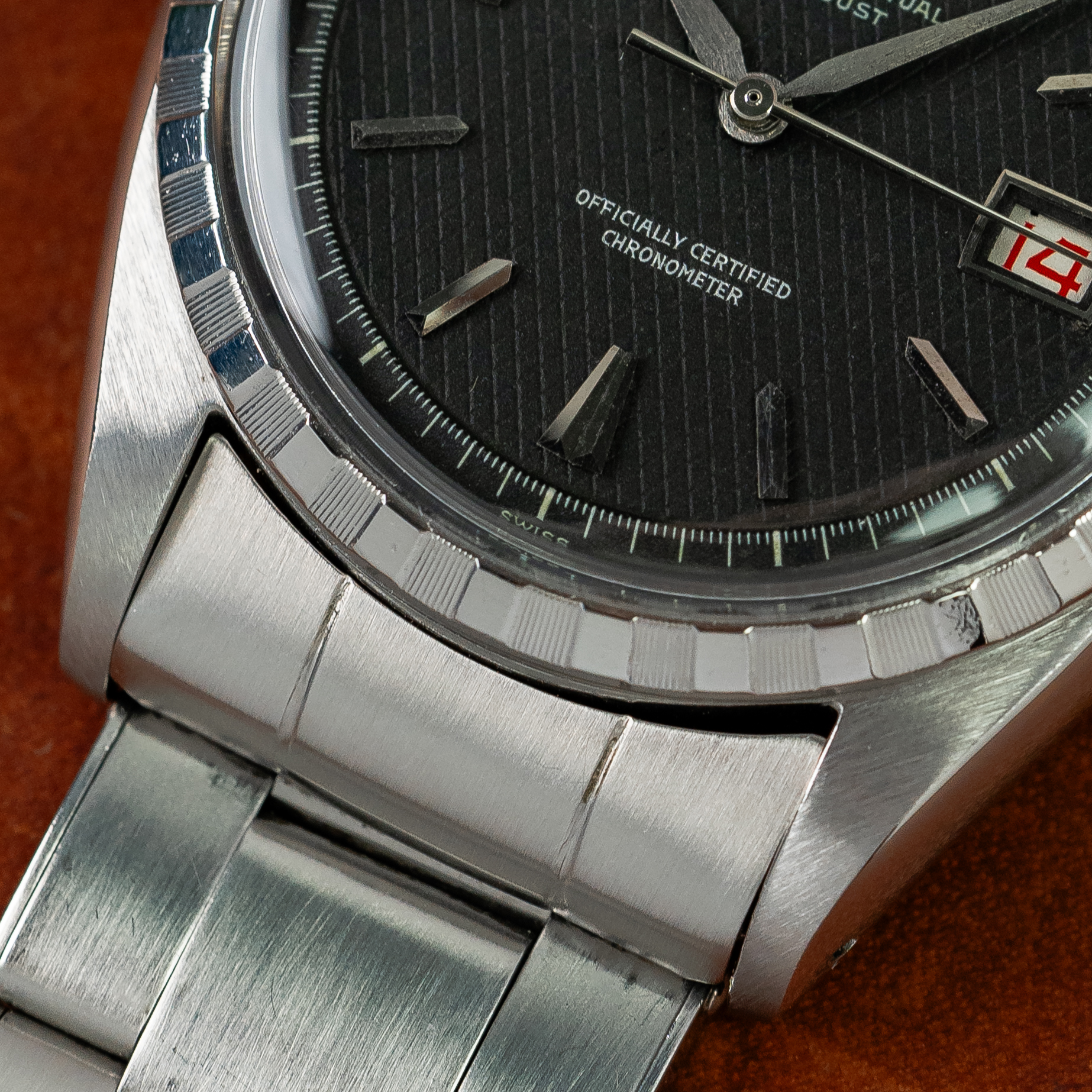 For the dial there were merely two options: either dark or light colored. This was before blue, grey, champagne etc. was used. The lacquer might discolor over time due to outside agents and result in a brownish surface. This effect possibly being enhanced by the use of radioactive luminous compound at the markers and in the hands. All dials were signed “Swiss” at the bottom and followed up on the “Swiss made” signature from earlier generation Datejusts. Service dials tend to display “T Swiss T” as the radium was substituted by tritium in the 1960’s. Depending on the country of delivery it might lack lume as a whole.
